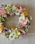 やさしい 軽やかな明るい色合いで いろいろな花顔を 楽しんでいただけますように。リース左のピンクのリボンは、取り外しできます。