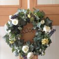 アイビーやバラ、ラベンダーなどのアーティフィシャルフラワーリースです。