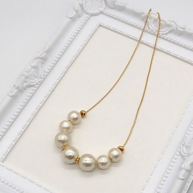 コットンパールを細いチェーンに通してデコルテ部分に並べたシンプルなデザインのネックレスです。