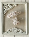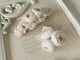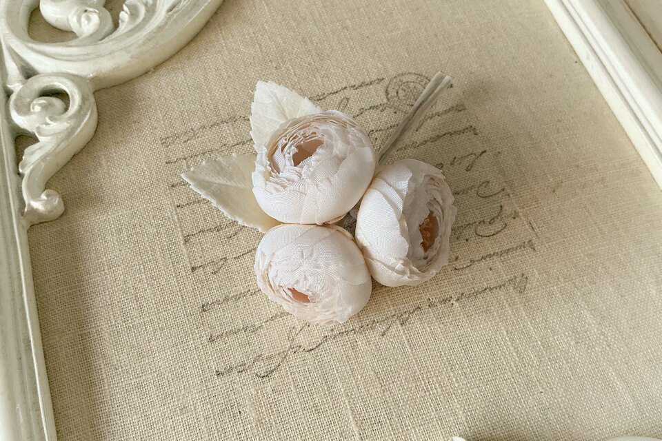 ほころび始めたカップ咲きのバラを3輪まとめたようなコサージュ。