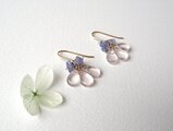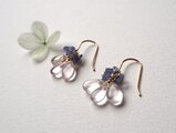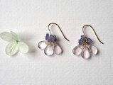 淡く透き通ったローズクォーツで花びらのようなピアスを作りました。ぷっくりした淡い桜色のピンクのローズクォーツのペアシェイプが花びらのように連なり、青紫のタンザナイトがガクのようなアクセントに。ぷっくりした雫型の丸み、淡いうっすらしたピンクは肌なじみもよく、耳元から淡い桜の花びらのような天然石がぶら下がる愛らしいさ。