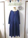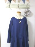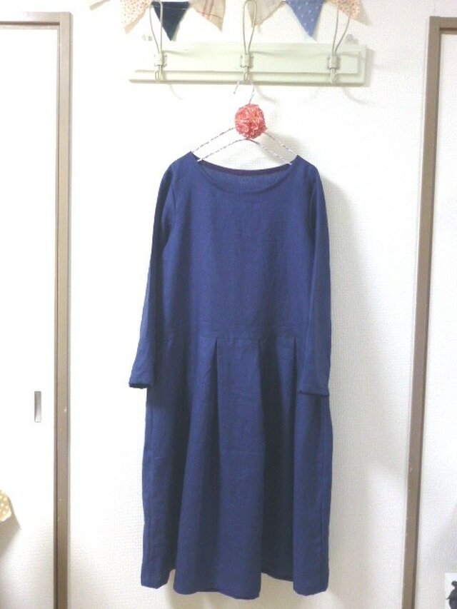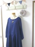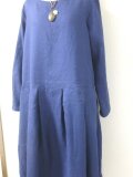スモーキーブルー色 リネン100%生地 ウエストタックワンピースML