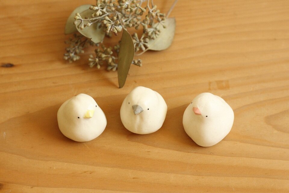 和菓子屋さんからゆずりうけたひよこまんじゅうの型にひとつひとつ土を込めて、ちいさなひよこを作りました。こちら定番のシロマルシリーズ(マット)。くちばしの色は全10色。カラーオーダーで承ります!体全体はマットの釉薬をかけています。本物の大福のよう。