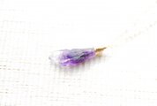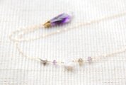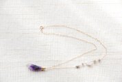 きれいな紫色を引き立てるよう希少石のスコロライトを中心にパールやラブラドライト、ボタンカットのアメジストを配しています