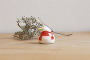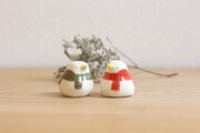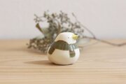 和菓子屋さんからゆずりうけたひよこまんじゅうの型にひとつひとつ土を込めて、ちいさなひよこを作りました。こちらは2匹セットのひよこのつがい。赤と緑のボーダー柄マフラーを巻いています。バレンタインデーの贈りものにもオススメです!