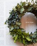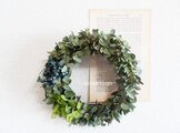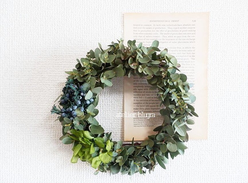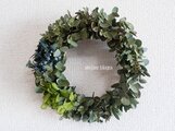 フレッシュグニーユーカリでシックなWreathにしてみました。プリザーブドのマウンテンジュニパーと紫陽花を添えて、アンティーク&セピアになりまで長くお楽しみください。