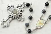 モリオンとヌーマイトを使用したダークカラーの色合いがシックで美しく、エルサレムストーンが入ったクロスが印象的なロザリオです。