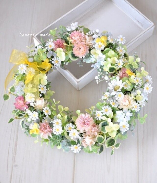 リース土台:ナチュラル素材 直径約20センチ リース素材:アーティフィシャルフラワ-(造花):デージー・スノーボール・ヴィオラ・プミラ・ユーカリ、など。自然素材:ヘリクリサム。その他:リボン飾り(リース左上の黄色いオーガンジーリボンは取り外しできます)、など。