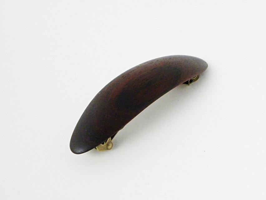 木工ロクロで大まかに形を削り出し、細部を調整。透明のウレタン樹脂塗料とミツロウワックスで仕上げたバレッタです。それぞれの木が持つ色や木目がそのままの作品です。