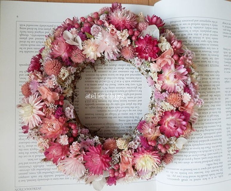 ピンクのヘリクサムがいっぱいのWreathで感じて頂きたいと思い作りました。アンティーク&セピアになりまで長くお楽しみください。