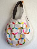 生成りのコットンリネンに、色とりどりのフエルトを散らして、ウッドビーズもあしらいました。