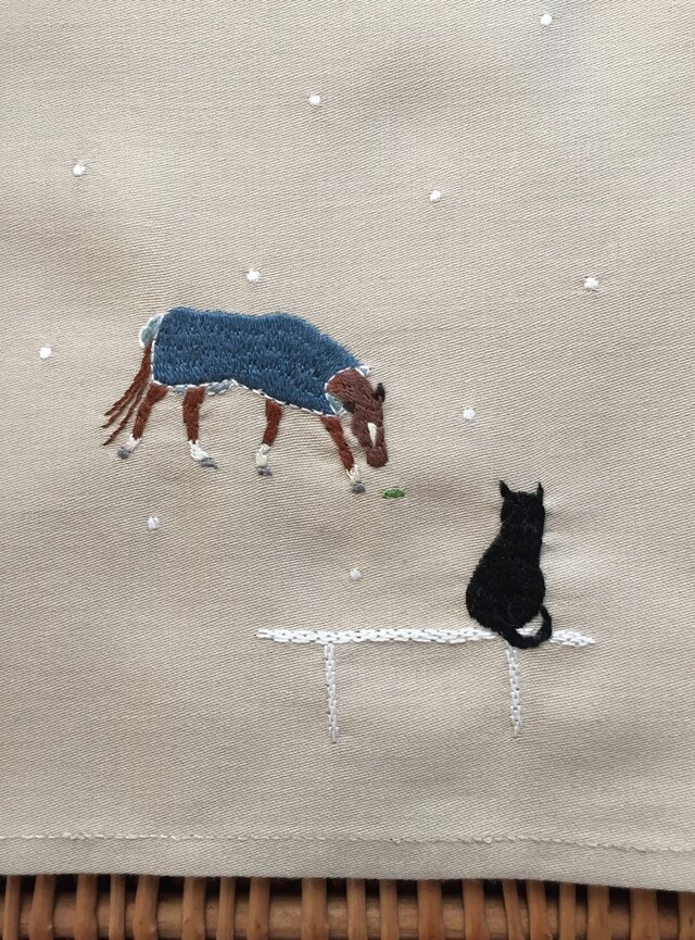 馬を見ている黒猫を刺しゅうしたハンカチです。
