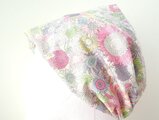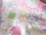 沢山のひまわりが丁寧に描かれています。 生地の地の色がオフホワイト、お花には、ピンク、ライトピンク、ミントグリーン、アイスブルー、クリームイエロー、ライトグレーなどが配色されています。