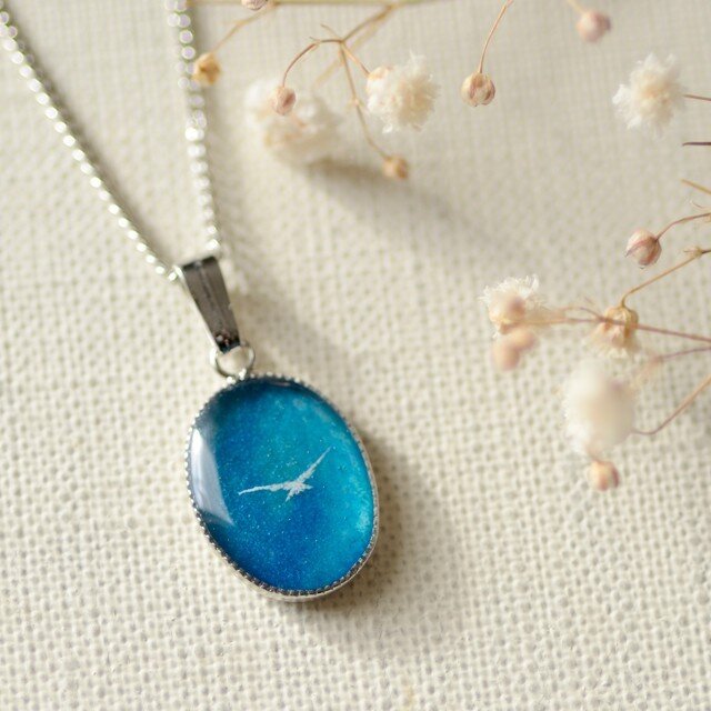 手描きのオリジナルイラストを樹脂で閉じ込めたちいさなペンダントです。