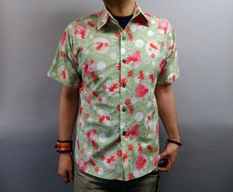 薄手の綿生地に雪輪に金魚と桜が描かれた粋なシャツ