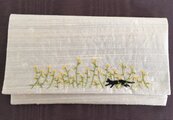 猫と菜の花を手刺しゅうした懐紙入れです。通帳も入る大きさなので普段使いにどうぞ。
