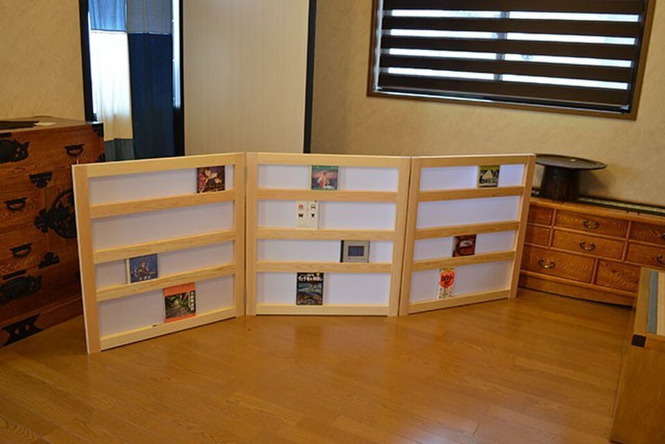 お気に入りのCDや文庫本などを飾り、衝立、パテーションなどにご利用頂けます。一・三段目にはCD、二段目には文庫本、四段目には新書本が入ります。