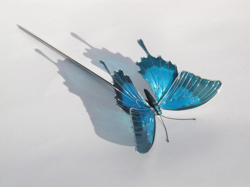 オオルリアゲハをモチーフに、ディップアートの技法を用いて制作した簪(かんざし)です。