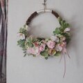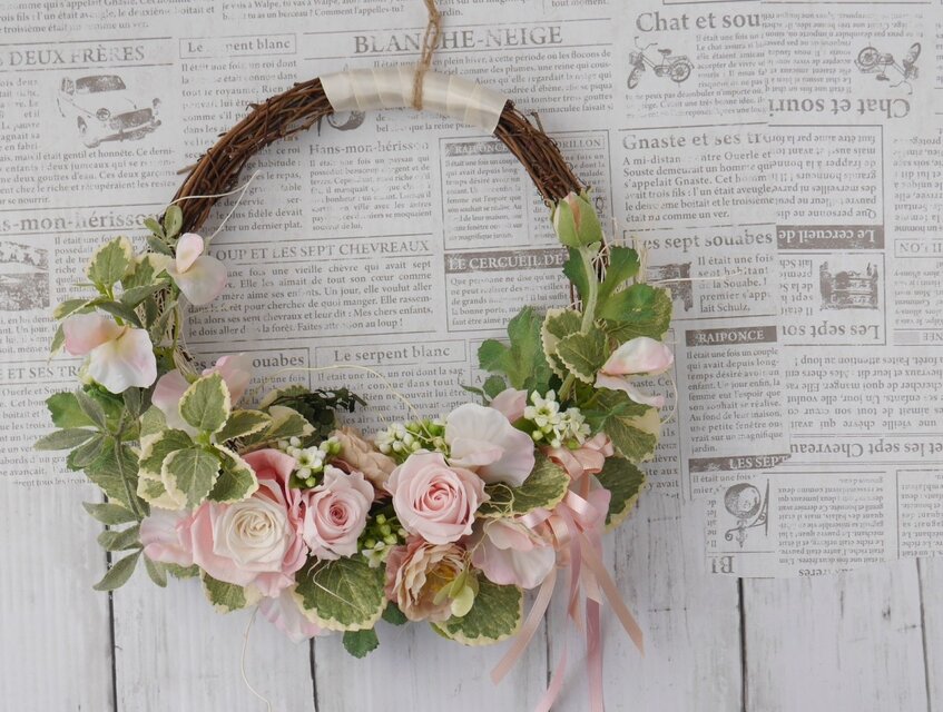 ピンクのバラとベージュのラナンキュラスを花かご風のリースにしてみました。柔らかいベビーピンク色のバラとヒラヒラしたスイトピーの花びらが愛らしい雰囲気です。