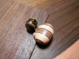 ポッチの部分は縞黒檀(表の木)&アフリカンブラックウッド(後ろの木)の間にメイプルのラインが入るように寄木、ネコ部分はメイプル&ウォルナットの間にローズウッドのラインうを入れたきぐるみ部分に、さらに面白い木目の縞黒檀を組み合わせて寄木しました。