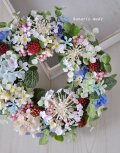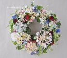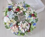 リース土台:ナチュラル素材 直径約13センチ リース素材:アーティフィシャルフラワ-(造花):レースフラワー・バラ・ライラック・スノーボール・ミニフラワー・フランボワーズ・ユーカリ、など。
