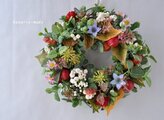 グリーンをベースに、間に黄色に紅葉した葉をあわせました。赤いスズメウリの実をたくさんあいだにアレンジし、白い実もそえました。赤い千日紅の花と、ブルーのベルフラワーがアクセントにはいっています。ピンクの小花、黄色の花などもアレンジしています。