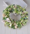 ころころとした実物の愛らしさと、グリーンの落ち着いたトーンをあわせもつリースです。
