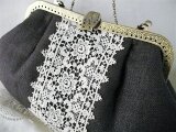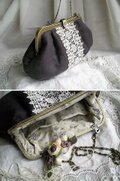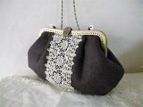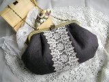 ダークブラウンに近いシックなパープルリネンにアンティークギュピールをのせたがま口バッグ