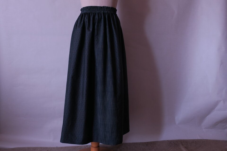 藍大島と縦縞の紬のスカートです。どちらの生地も手織りです。
