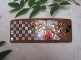 木目を活かす拭きうるし仕上げです。螺鈿の市松模様とてっせん蒔絵を組み合わせました。