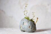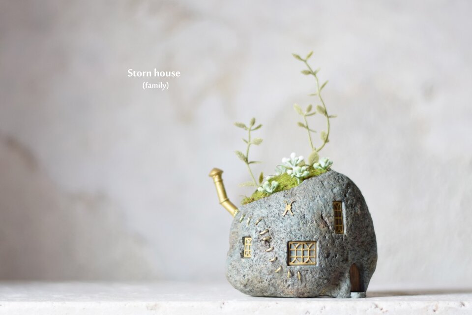 石の家のプランターオブジェ。自然の石を型取りして作っています。
