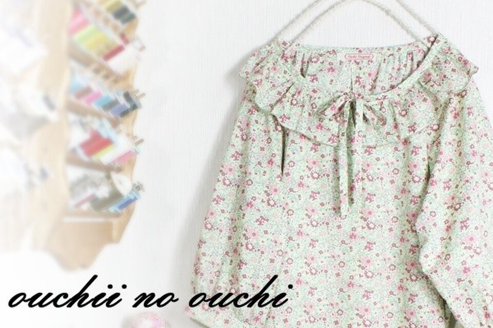 リバティタナローン人気柄Doraドラで巻きロック仕上げのフリル襟リボンラグランブラウスを作りました。