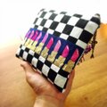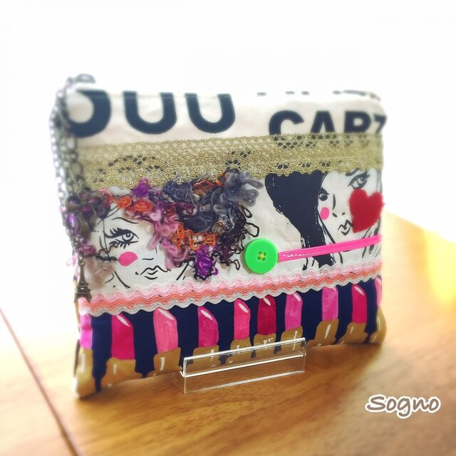 パリジェンヌをゴージャスでキュートなフラットファスナーのポーチに仕上げました。もちろんこだわりもたくさん詰め込んでおります。フランス製のレース、イタリア製の毛糸を使ったパリジェンヌの髪の毛、Selfish.Mさん独自の発色で染められたボタン。ファスナーを開くと、たくさんの唇が飛び出します。ファスナーチェーンはSognoオリジナルで、2種類のチェーンをバランスよく合わせております。バッグの中の小物の整理整頓などにお使い下さい。裏面も切り替えております。写真でご覧下さい☆