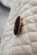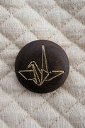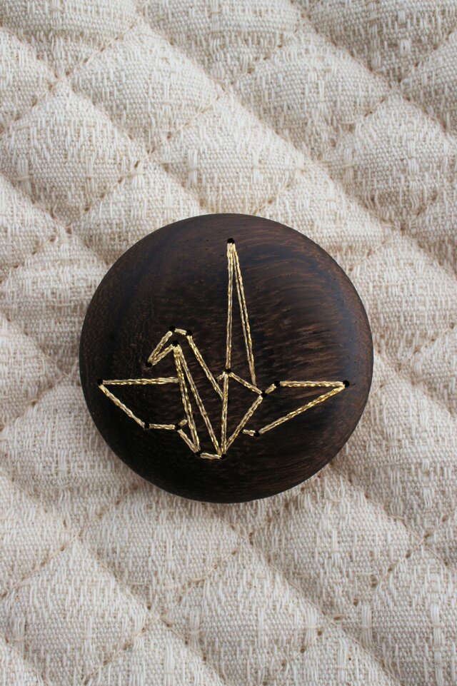 「おもてなし。」 木に穴をあけ、ステッチで折鶴をデザインしました 〇直径40mm 重さ 7g 〈制作画像の素材〉 木 黒檀 糸 金色(錦糸)