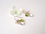 透明なようでいて極淡いピンクのモルガナイトに、鮮やかな葉っぱの黄緑のペリドットを添えた苺カラーイメージのピアスです。石にはカットやクラックが入っていてキラキラ輝きます。ローズクォーツのボタン石を添えて。雪解けのようなきらめきと淡いカラーが季節にぴったりです。(石の性質上、小さな内包物やクラックが見られますが、使用して気になるほどではありません)
