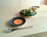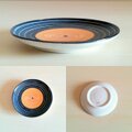 レコードをお皿にデザインしました。黒とオレンジに塗りわけ、ラインとサインを掻きおとしています。全体に淡く白くなる釉薬をかけています。