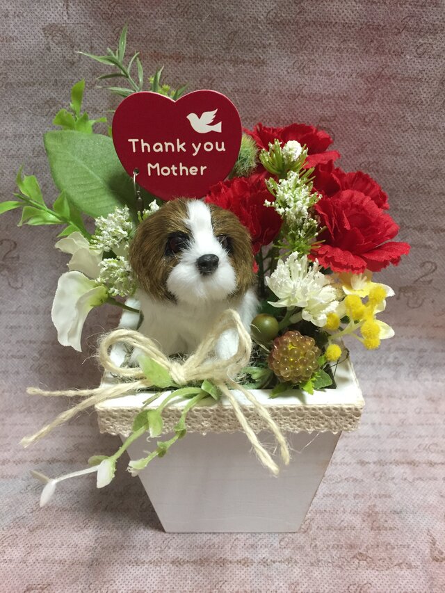 こちらは以前より再出品のご依頼を何件かいただいていた、わんちゃん好きのお母様へのギフト用にお使いいただけますシーズーと赤いカーネーションのアレンジです。