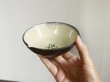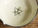 小鉢の内側に白い化粧泥を掛けエンレイソウの花弁を描き、器全体に透明釉を掛けてから花のまわりに淡緑色を彩色して焼成しています。
