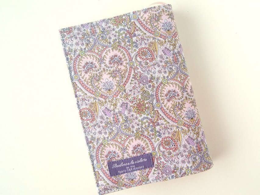 リバティの人気生地、 Kitty Grace キティグレース(ピンクパープル)とハーフリネンの生地でブックカバーを作りました。