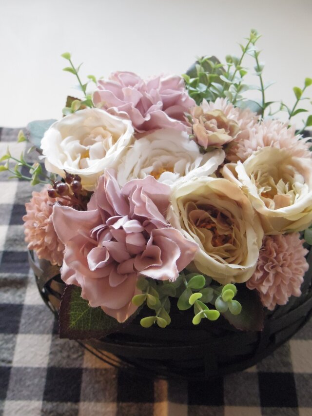 アンティークカラーのくすんだピンクやベージュの花を中心に