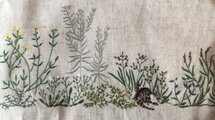 新緑の季節にぴったりな緑色のスカートが届いております 細い糸でこれでもかと思えるほど繊細なハルジオンの白い花、菜の花なずなの白い花が生き生き元気に春を喜んでるみたいです 可愛らしいカラスノエンドウ、清々しく青い空に似合う忘れな草までキジトラ猫さんを遊んでくれているようです♪ 美しすぎる作品を、しばし飾って眺めたいです