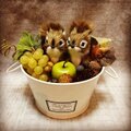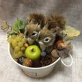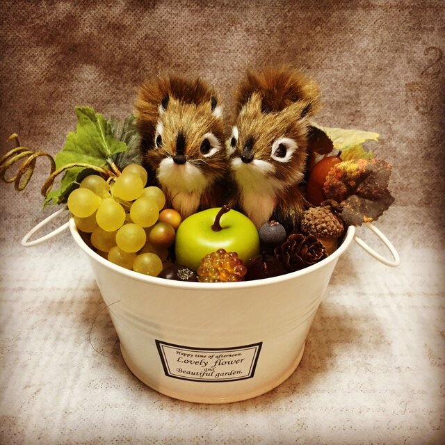 こちらはブリキの器にリスさん2匹、フェイクのぶどう、グリーンアップル、ラズベリー、どんぐり等で飾ったアレンジになります。