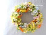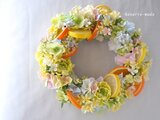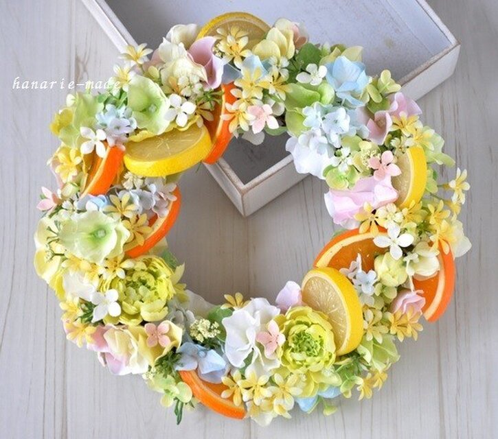 リース土台:ナチュラル素材 直径約20センチ リース素材:アーティフィシャルフラワ-(黄色小花・紫陽花(ライトグリーン・ピンク・ライトブルー・イエロ-・ホワイト)・ラナンキュラス・ブバリア(ホワイト・ライトピンク)スノーボール・レモンスライス・オレンジスライス・ユーカリ、など)