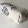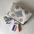 ミルキーホワイトのリネン生地にクロス・ステッチで四角のようなお花のような模様を