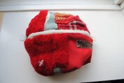 素材の違った赤の生地を合わせて可愛く仕上げました。金のビーズで少し模様も。
