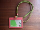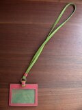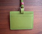 鮮やかなピンクとグリーンの本革を使った、IDカードホルダーとストラップのセットです。