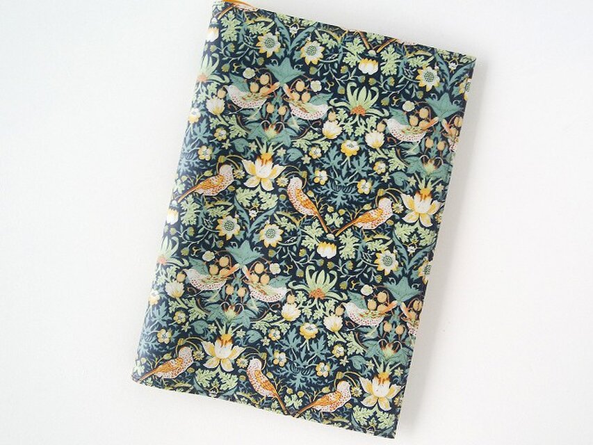 リバティの人気生地、Strawbery Thief ストロベリーシーフ(グリーン)のラミネート生地(つや無)でA5サイズのノートカバーを作りました。