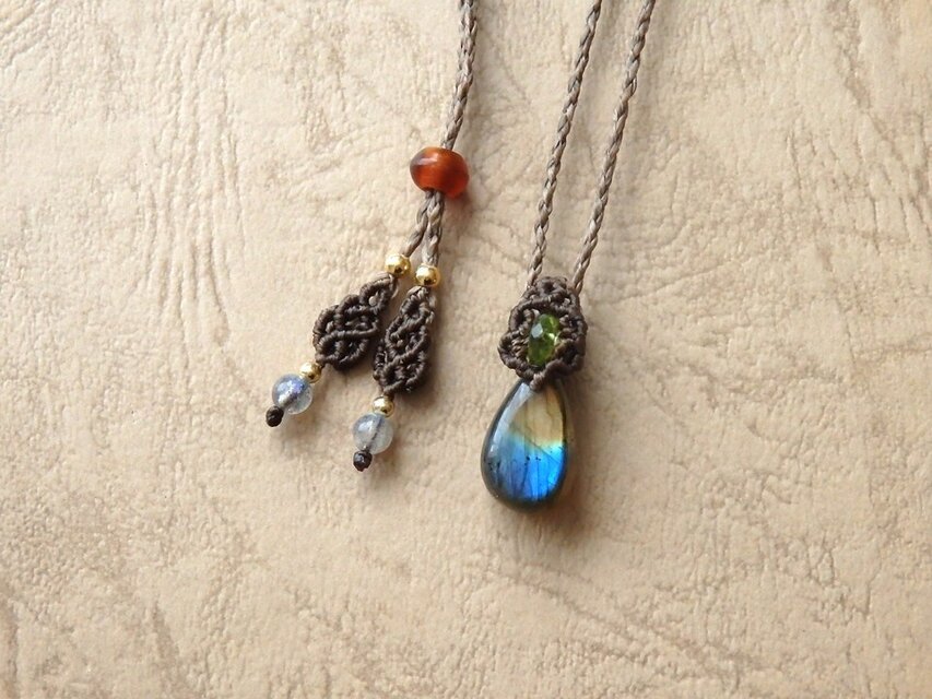 ■材料:ワックスコード、メタルビーズ、ボーンビーズ、ペリドットビーズ、ラブラドライトビーズ