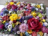 使用材料 ソラフラワー、薔薇、ちどり草、ヤロー、アンモビウム、スターチス、ダイヤーズカモミール、グロボーサ、サマーチェリー、貝細工、センニチコウ、ラナンキュラスなど。