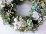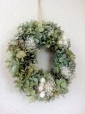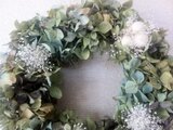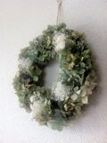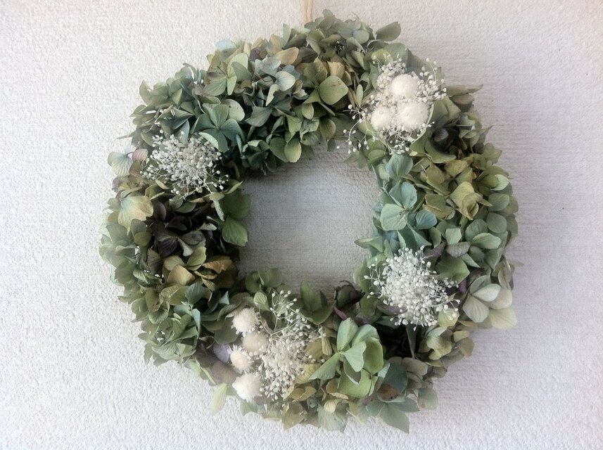 趣きのある秋色あじさいと、ブリザーブドフラワーのかすみ草、ポアプランツのシンプルでボリュームのあるリースです。